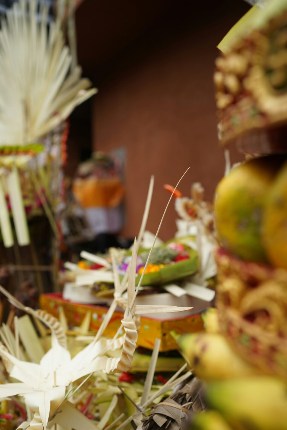 De petits paniers tressés remplis de fleurs, de riz et d’encens, déposés au seuil des maisons, des boutiques, des temples. Elles expriment gratitude, respect, délicatesse. Le matin, lorsqu’on marche dans les rues, Bali semble respirer à travers elles. Ces offrandes sont le fil invisible qui relie l’île à son harmonie intérieure.