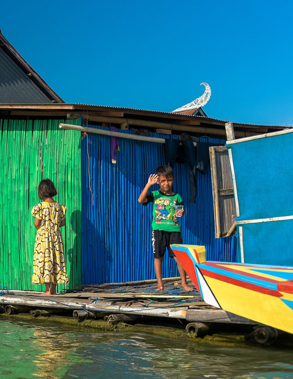 Sur les eaux peu profondes, les communautés Bugis ont bâti leurs vies sur pilotis, naviguant doucement entre les saisons. Leurs maisons bougent légèrement selon le niveau de l’eau, leurs filets de pêche glissent sur la surface, les enfants se rendent à l’école en pirogue, les femmes vont puiser l’eau ou laver les vêtements sur le bord. Le rythme de vie ici dépend du lac, des saisons, des crues, du poisson.